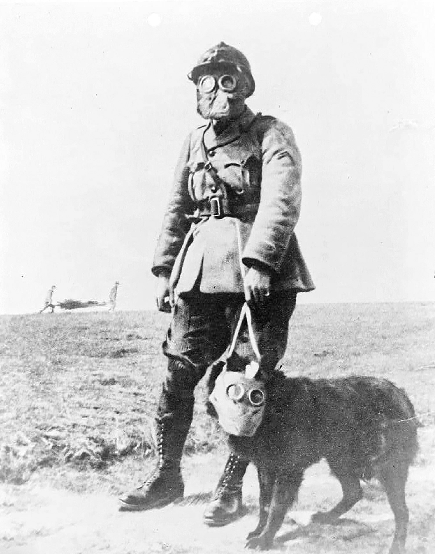 A vintage photo archived with the National Library of Congress in the U.S., reveals a French army sergeant and his canine companion wearing gas masks while on duty on the Western Front in 1916. Dimly visible in the background are two stretcher-bearers transporting a wounded back to base for medical attention, clearly suggesting this photo was captured quite close to the action.