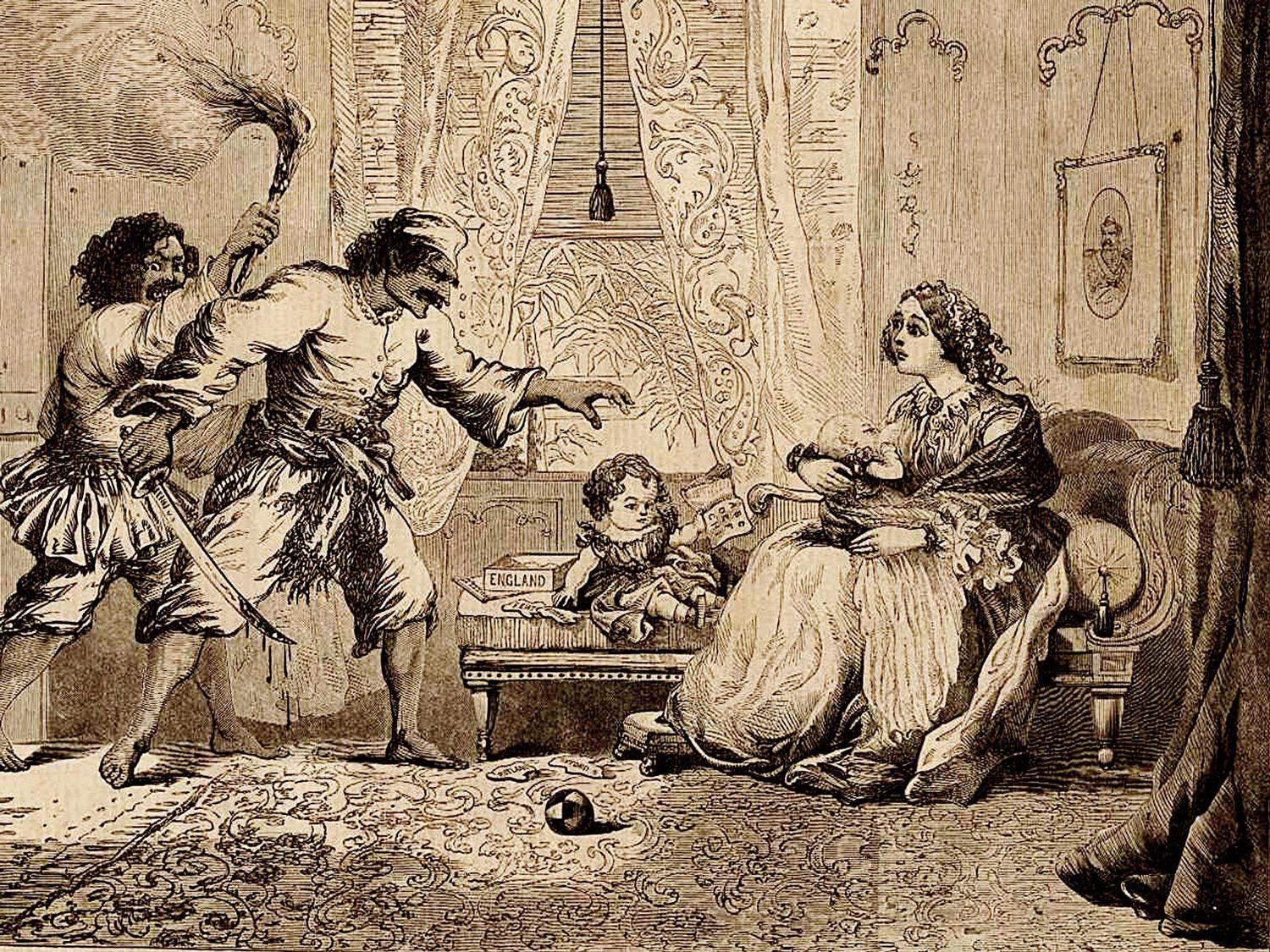In the illustration, the two sinister-looking men, armed with a burning torch and a sword are recognizably Asiatic in dress and appearance. They represent the violent mobs that had attacked Europeans in their homes during the proceedings of the Mutiny, in 1857.
