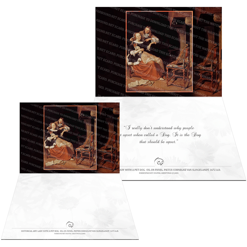 History: This Greetings Card for Dog Lovers features a historical painting titled,'A lady and her pet Dog'. The painting is an oil on panel painting and was produced by artist Pieter Cornelisz Van Slingelandt in 1672 Ad. The original painting is at the Dresden State Art Collections Museum, Germany.