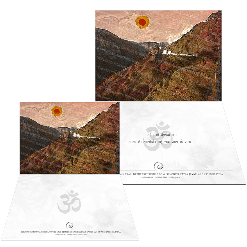 History/Mythology: This Greetings Card/Good Wishes Card/Festive Card for sending good wishes to friends and family, features a photoart presentation of the mountain trail to the cave temple of Vaishnodevi, in Katra, Jammu and Kashmir. The earliest mention of the Vaishnodevi comes from the Mahabhagavata Purana. The original temple is believed to have been built between the 11 and 12 Ce. In 1846 the Maharaja Gulab Sing established the Daramart Trust for the welfare of several temples in his territory including the Vaishnodevi. The card is meant for the festival of Navratri. It can also be sent on any other special occasion. The message in the Prewritten version of the card is in Hindi.