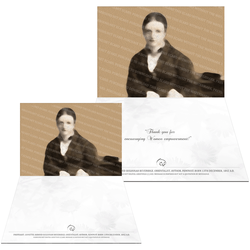 History: This Greetings Card/Thank you Card for expressing gratitude and give thanks, features a photoart representation of Annette Akroyd Susannah Beveridge. Born on the 13th of December in 1842 Ad., Annette Beveridge was a British orientalist, a civil rights activist, a women's rights activist and an author and translator. She was the first Westerner to translate into English, the Humayun-Namah, a narration of the Gurkani emperor Humayun's life and reign by his half-sister Gulbadan Begum. Annette Beveridge also helped establish the Hindu Mahila Vidyalaya, a school for empowering Bengali women.