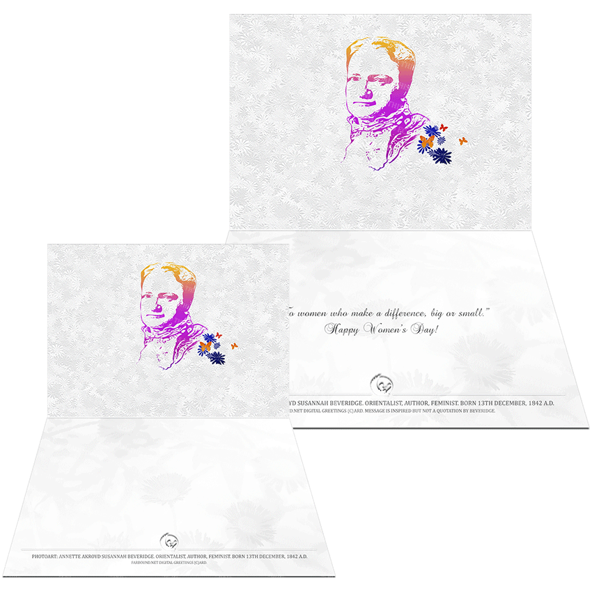 History: This Greetings Card for Women's Day features a photoart representation of Annette Akroyd Susannah Beveridge. Born on the 13th of December in 1842 A.D., Annette was a British orientalist, a civil rights activist, a women's rights activist and an author and translator. She was the first Westerner to translate into English, the Humayun-Namah, a narration of the Gurkani emperor Humayun's life and reign by his half-sister Gulbadan Begum. Annette also helped establish the Hindu Mahila Vidyalaya, a school for empowering Bengali women.