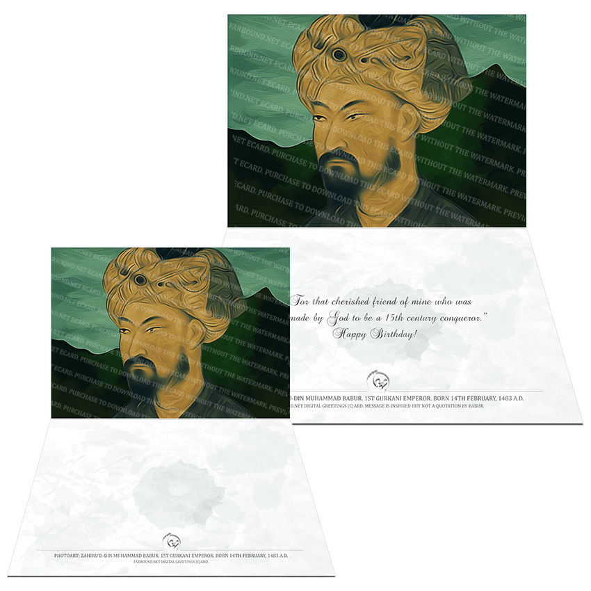 History: This Greetings Card for Birthdays features a photoart representation of Zahiru'd-Din Muhammad Babur. Born on the 14th of February in 1483 Ce., Zahiru'd-Din Muhammad Babur was a Turcko-Mongol chieftain. He was a descendant of two noted Central Asian conquerors. That of Genghis Khan from his mother's side, and Timur from his father's side. Babur was also the 1st Gurkani (Mughal) emperor of the Gurkani Empire, a successor state of the Mongolian Empire. The artistic presentation of Babur is based on a painting of Babur and Humayun from the Shah Jahan collection of miniature paintings - created in the 16th century. In Persian, the name Babur means a Tiger.