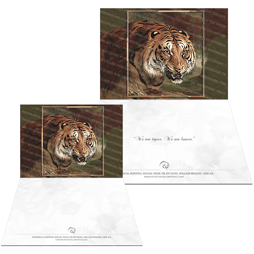 History: This Greetings Card/Motivational Card/Inspirational Card for inspiring and motivating friends and loved ones who happen to be loners, features a historical painting titled, 'Bengal Tiger.' The painting is an oil on panel painting and was produced by artist William Huggins in 1838 Ad. William Huggins was then only 18 years old. The original painting is with Cristies Art Dealers and Auctions.