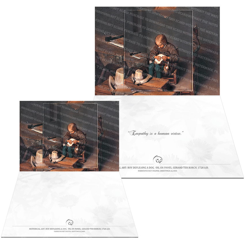 History: This Greetings Card for Dog Lovers features a historical painting titled,'Boy defleaing a Dog'. The painting is an oil on panel painting and was produced by artist Gerard Ter Borch in 1728 Ad. The original painting is at the Rijksmuseum in Amsterdam, Netherlands.