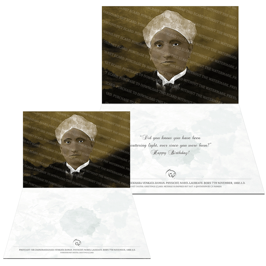 History: This Greetings Card for Birthdays features an artistic presentation of physicist, Chandrasekhara Venkata Raman. Born on the 7th of November in 1888 Ce., Venkata Raman was a Fellow of the Royal Society, a Nobel Laureate and a Bharat Ratna awardee. He is known worldwide for his valuable work in the field of Light Scattering. In 1930 Ce, he was awarded the Nobel Prize in Physics for his discovery of a new form of Light Scattering, which was subsequently named the 'Raman Effect' and 'Raman Scattering' in his honour. Venkata Raman discovered this natural phenomenon with his assistant and student, K.S. Krishnan. Venkata Raman was the first Asian to receive a Nobel Prize in Physics.