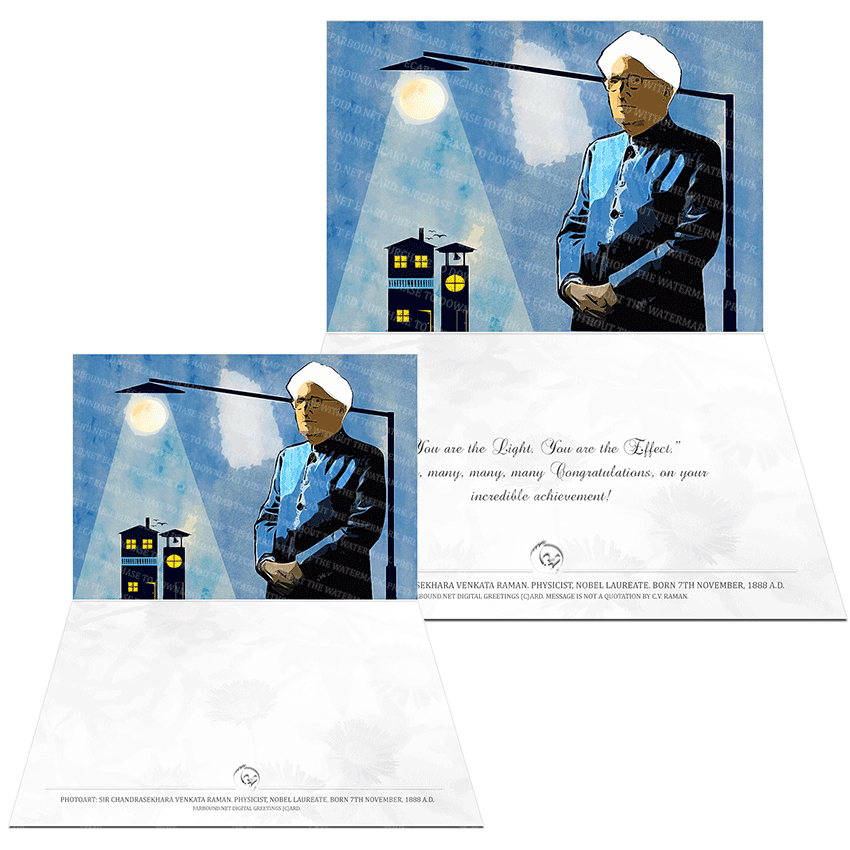 History: This Greetings Card/Congratulations Card/Congrats Card for commemorating historical people and congratulating friends, family members and colleagues, features a photoart presentation of physicist, Chandrasekhara Venkata Raman. Born on the 7th of November in 1888 Ce, Ventaka Raman was a Fellow of the Royal Society, a Nobel Laureate and a Bharat Ratna awardee. Venkata Raman is known worldwide for his valuable work in the field of Light Scattering. In 1930 Ce, he was awarded the Nobel Prize in physics for his discovery of a new form of Light Scattering, which was subsequently named the 'Raman Effect' and 'Raman Scattering' in his honour. Venkata Raman discovered this natural phenomenon with his assistant and student, K.S. Krishnan. Raman was the first Asian to receive a Nobel Prize in physics.