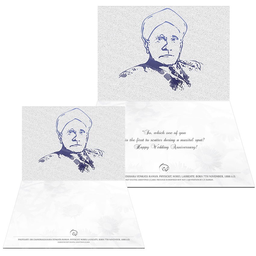 History: This Greetings Card/Anniversary Card for Wedding Anniversaries, features a photoart presentation of physicist, Chandrasekhara Venkata Raman. Born on the 7th of November in 1888 Ad., Venkata Raman was a Fellow of the Royal Society, a Nobel Laureate and a Bharat Ratna awardee. He is known worldwide for his valuable work in the field of Light Scattering. In 1930 Ad, Venkata Raman was awarded the Nobel Prize in Physics for his discovery of a new form of Light Scattering, which was subsequently named the 'Raman Effect' and 'Raman Scattering' in his honour. Venkata Raman discovered this natural phenomenon with his assistant and student, K.S. Krishnan. Venkata Raman was the first Asian to receive a Nobel Prize in Physics.