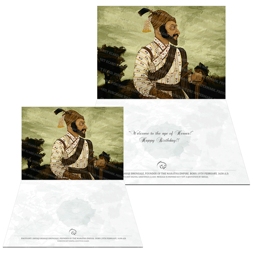 History: This Greetings Card for Birthdays features a photoart representation of Shivaji Shahaji Bhonsale. Born on the 19th of February in 1630 Ce., Shivaji Shah Bhonsale was the founder of the Maratha Empire, and is a celebrated historical hero in India.