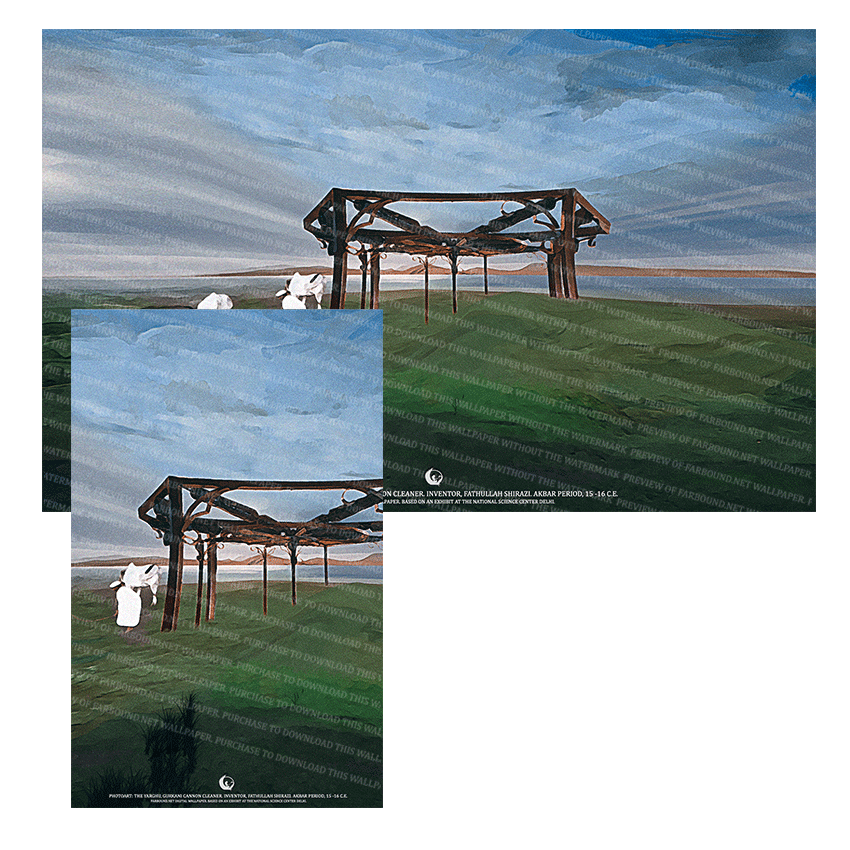 History: This Digital Wallpaper/Desktop Wallpaper/Desktop Background/Laptop Wallpaper/Mobile Phone Wallpaper/Medieval Inventions Wallpaper/Mughal Inventions Wallpaper/Mughal Wallpaper/Mughal Cannon Cleaner Wallpaper, features a photoart presentation of a Gurkani (Mughal) Cannon Cleaner known as the Yarghu. Invented by Fathullah of Shiraz, a Persian (Iranian) courtier, minister and inventor, who lived during the reign of Gurkani (Mughal) emperor Jalal-ud-din Muhammad Akbar, the Yarghu was a cumbersome yet unique contraction used in cleaning multiple midsize cannons simultaneously. The name Yarghu is an old Mongolian word and stands for a court that investigates and punishes corrupt officials. Its association with the contraption, very likely a hint of the Gurkani (Mughals) ancestral ties with the Mongol people, especially Genghis Khan and Timur. To know more about this Gurkani (Mughal) multi cannon cleaner, see the Farbound.Net story: What men could do, Yarghu could do better. The replica on which this artistic presentation is based is on exhibit at the National Science Center Delhi.