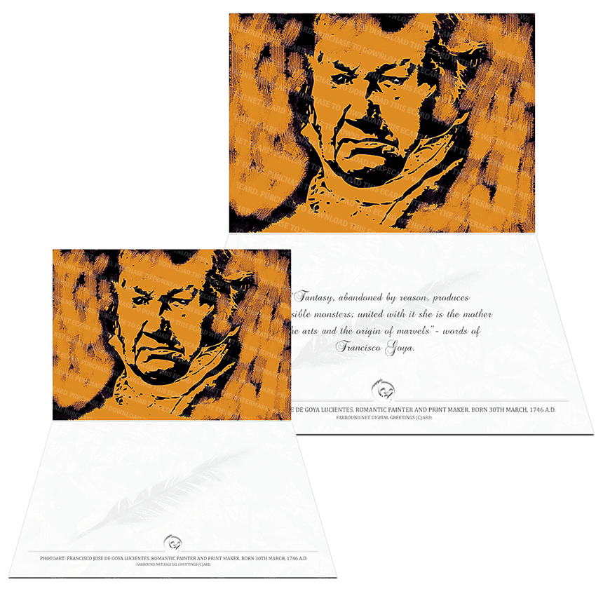 History: This Greetings Card with a Genuine Quotation features a photoart representation of Francisco Jose De Goya Lucientes. Born on the 30th of March in 1746 A.D Francisco Goya was a Spanish Romantic Painter and Print Maker. He is considered to be one of the prominent figures in the art genre of Romanticism.
