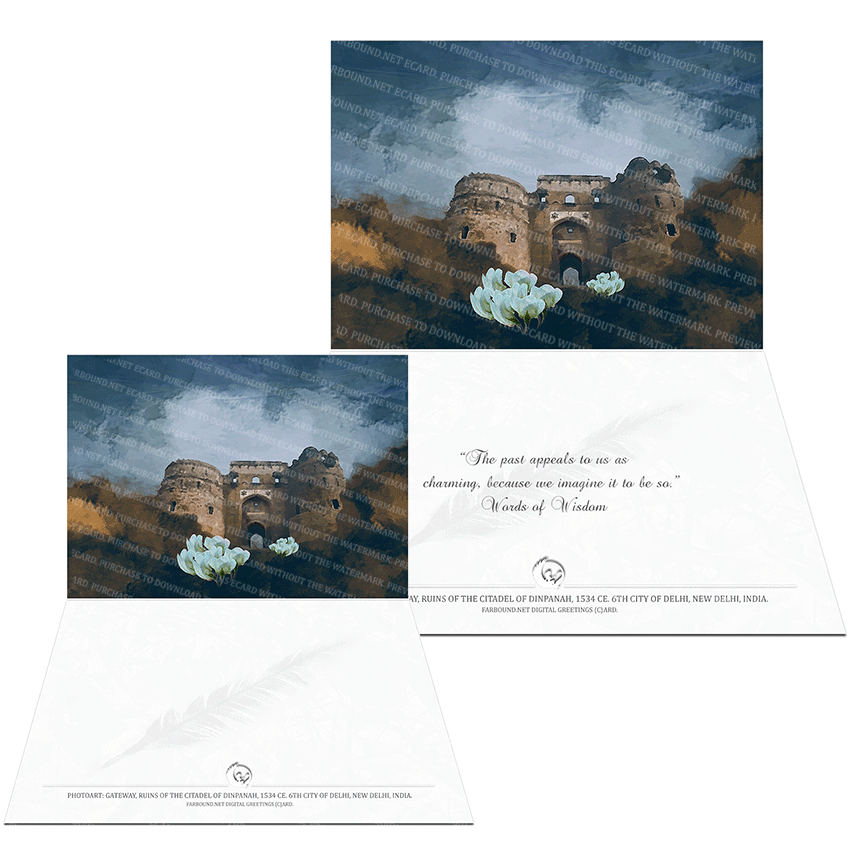 History: This Greetings Card/Meaningful Card with words of wisdom on why the past seems to us as charming, features a photoart presentation of a gateway of the citadel of Dinpanah. Commissioned for construction by the Gurkani Emperor Humayun, Dinpanah was the sixth city of Delhi. The city was established as a symbol of imperial tolerance for all religions, especially the different sects of Islam. To know more, see the Farbound.Net story: Dinpanah, the city of Humayun.