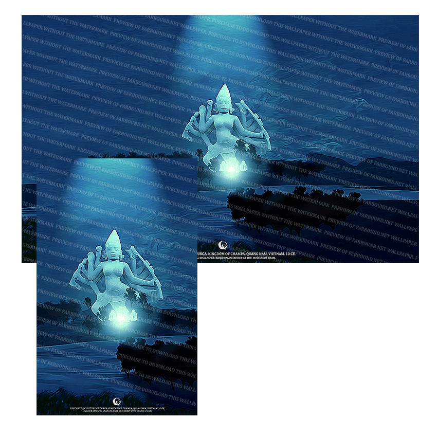 History: This Digital Wallpaper/Desktop Wallpaper/Desktop Background/Laptop Wallpaper/Mobile Phone Wallpaper/Artifacts Wallpaper/Ancient Sculptures Wallpaper/Historic Sculptures Wallpaper/Hindu Gods Wallpaper/Devi Wallpaper/Shakti Wallpaper/Goddess Durga Wallpaper/Durga Wallpaper, features a photoart presentation of a stone sculpture of Durga. The sculpture was produced in the Hindu kingdom of Champa, in the capital city of Tra Kieu, Quang Nam, Vietnam, 10 Ce. The exhibit on which this artistic presentation is based is at the Museum of Cham in Vietnam. To know how the festival of Durgostava started, see the Farbound.Net snippet: The untimely awakening.