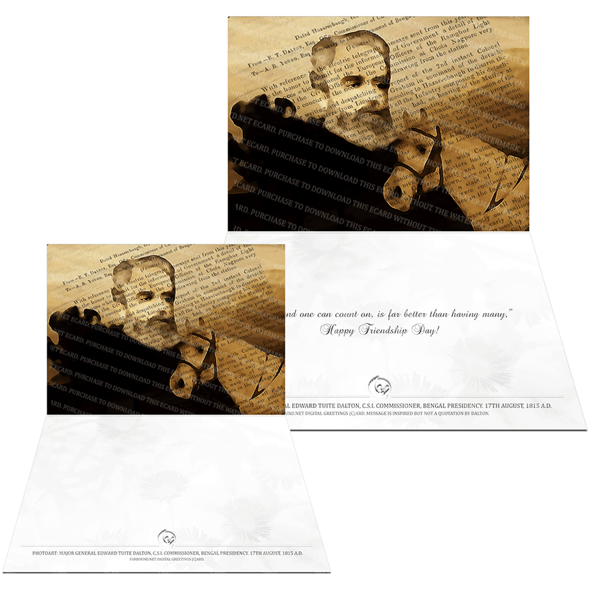 History:This Greetings Card/Sentimental Card/Friendship Day Card for commemorating historical people and expressing heartfelt sentiments to a friend, features a photoart presentation of Edward Tuite Dalton. Born on the 17th of August in 1815 Ad, Edward Dalton was an officer of the East India Company who went on to become a political agent and later the commissioner of what is today the Chota Nagpur province of Jharkhand, but was then a part of the Bengal Presidency. Edward Dalton was also a Major General in the Bengal Lancers, a cavalry unit of the British Indian Army and authored the 'Descriptive Ethnology of Bengal', the first comprehensive book of its kind to document the ancient tribes of India. For his long years of service, Edward Dalton was honoured with the Companion of the Order of the Star of India (CSI). In modern-day India, Edward Dalton is fondly remembered as the 'Righteous and Just' commissioner.