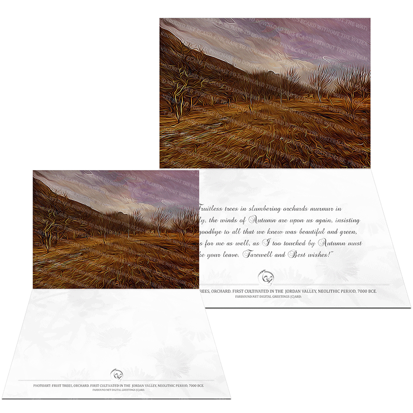 History: This Greetings Card/Farewell Card/Goodbye Card/Going-Away Card/Leaving Card bidding farewell and luck to friends, family and colleagues, features a photoart presentation of an orchard with fruitless trees in the month of Autumn. The practice of cultivating trees and orchards is believed to have started in the Jordan valley around 7,000 Bce, during what was the Neolithic period.