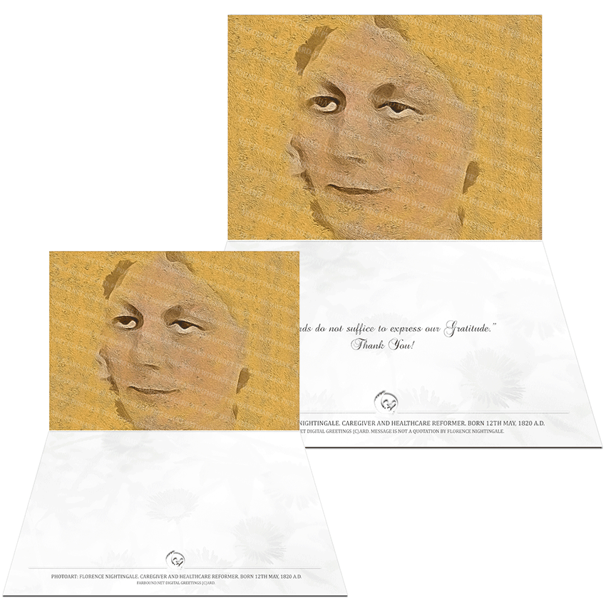 History: This Greetings Card/Thank you Card for expressing gratitude and give thanks features, a photoart representation of Florence 'Miss Smith' Nightingale. Born on the 12th of May in 1820 Ad, Florence Nightingale was a British caregiver and healthcare reformer. Her contribution paved the way for modern day nursing.