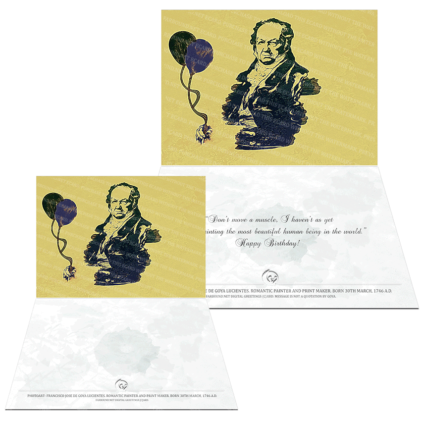 History: This Greetings Card for Birthdays features a photoart representation of Francisco Jose De Goya Lucientes. Born on the 30th of March in 1746 Ad, Francisco Goya was a Spanish Romantic Painter and Print Maker. He is considered to be one of the prominent figures in the art genre of Romanticism.