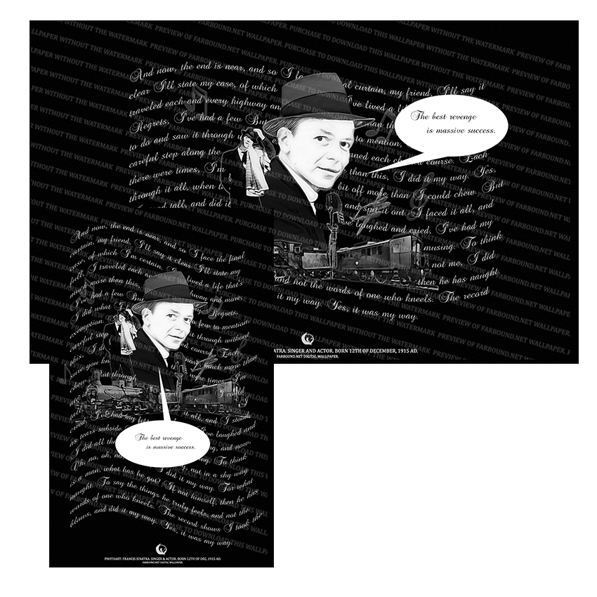 History: This Digital Wallpaper/Desktop Wallpaper/Desktop Background/Laptop Wallpaper/Mobile Phone Wallpaper/Black and White Wallpaper/Famous people Wallpaper for commemorating, honoring and remembering famous people, features a photoart presentation of Francis Albert Sinatra, more popularly known as Frank Sinatra. Born on the 12th of December in 1915 Ad, Frank Sinatra was a singer and actor. The wallpaper also features lyrics from his song titled, My Way and a quote by him.