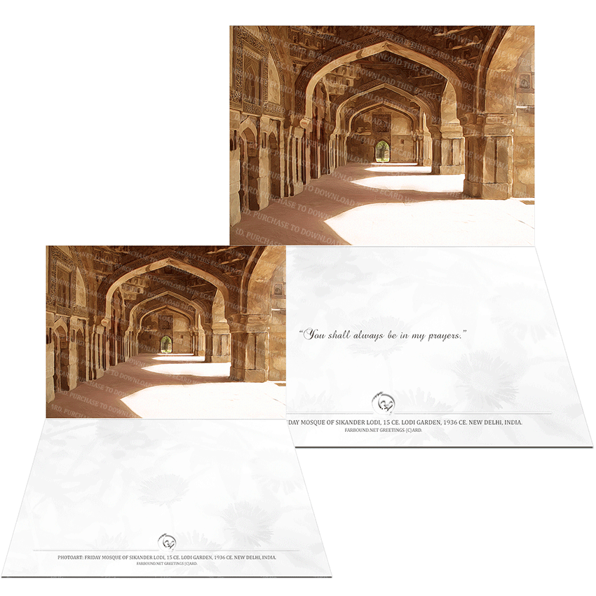 History: This Greetings Card/Sentimental Card for expressing heartfelt sentiments, features a photoart presentation of a three dome Mosque at Lodi Gardens. Built in the 15th century, during the reign of the Sultan Sikander Lodi, the three-dome mosque was an innovation of its time and a product of Indo-Islamic architecture. Exhibiting for the first time, three domes placed adjacent to each other and arches and pockets etched with Qur'anic inscriptions. To know more, see the Farbound.Net snippet: The one that started a trend.