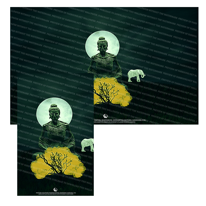 History: This Digital Wallpaper/Desktop Wallpaper/Desktop Background/Laptop Wallpaper/Mobile Phone Wallpaper/Artifacts Wallpaper/Ancient Sculptures Wallpaper/Historic Sculptures Wallpaper/Buddhism Wallpaper/Buddha Wallpaper/Gandharan Buddha Wallpaper/Buddha fasting Wallpaper, features a photoart presentation of a sculpture of Siddhartha Gautama, better known as the Buddha, fasting for enlightenment. The sculpture was produced in the region of Gandhara during the Kushan period in 2 Ce. Gandharan Sculptors were heavily influenced by Greeko-Roman styles and thus the Buddha sculptures to come out of their studios reflected Greek characteristics. This sculpture in particular is considered to be the best to emerge from the Gandharan School of Art. Informally known as the Shakyamuni, the sculpture depicts an emaciated Siddhartha Gautama fasting for enlightenment - with his ribs, veins and stretched skin visible. To learn more about Gandharan Buddhas, see the Farbound.Net story: The Greek Buddha, on the Farbound.Net website. The sculpture on which this artistic presentation is based is on exhibit at the Lahore Museum in Pakistan.