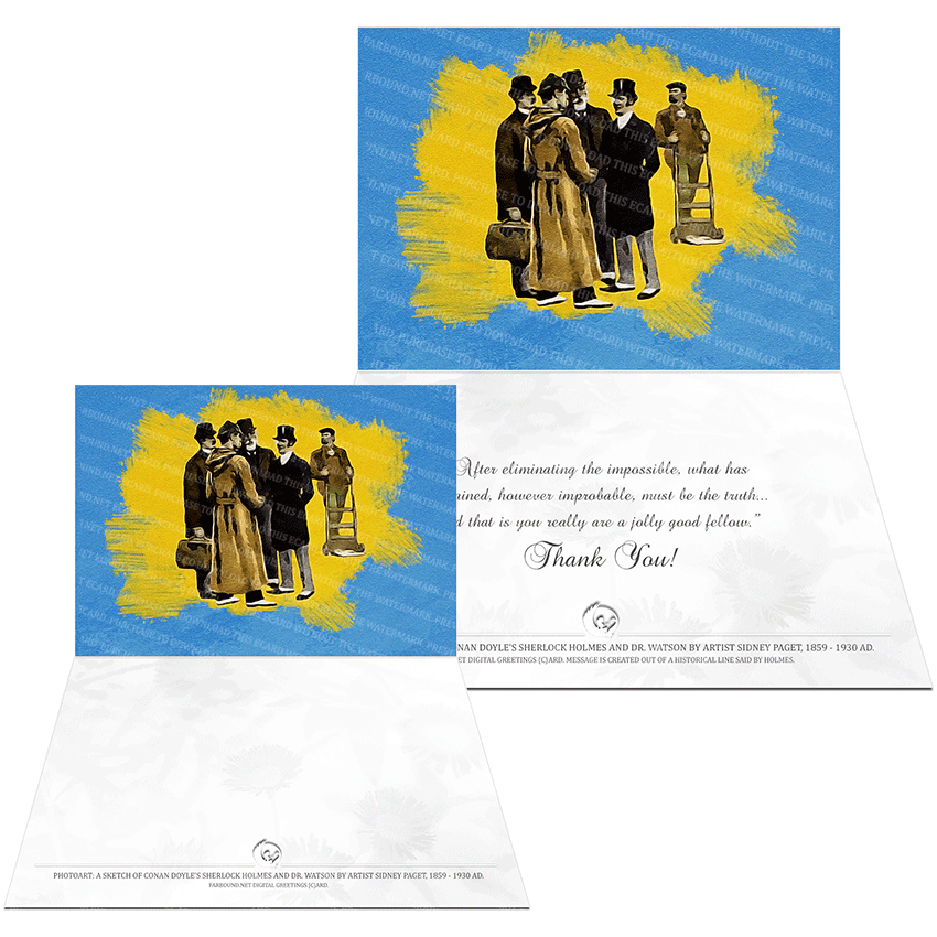 History: This Greetings Card/Thank you Card for expressing gratitude and give thanks, features a photoart presentation of a sketch of ace detective Sherlock Holmes and Doctor Watson. The sketch was created by Sidney Page between 1895 and 1904 Ad. Sherlock Holmes is a character created by Sir Arthur Conan Doyle.