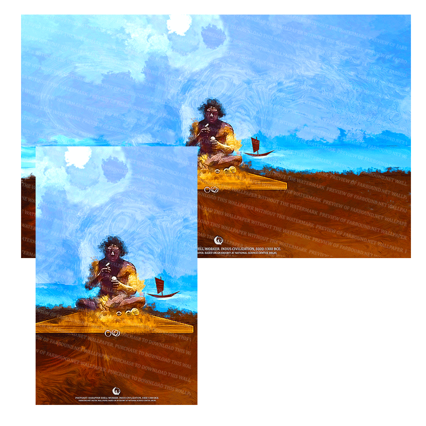 History: This Digital Wallpaper/Desktop Wallpaper/Desktop Background/Laptop Wallpaper/Mobile Phone Wallpaper/Harappan Wallpaper/Harappan Civilization Wallpaper/Indus Valley Wallpaper, features a photoart presentation of a Harappan Shell Worker. The Harappan Civilization, also known as the Indus Valley Civilization lasted from 3300 to 1300 Bce. The sculpture on which this artistic presentation is based is a mannequin on exhibit at the National Science Center Delhi.