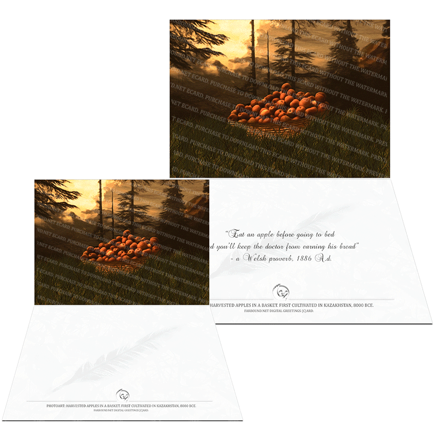 History: This Greetings Card with a Welsh proverb on Apples and Doctors from 1886 Ad, features a photoart presentation of a basket of apples. Though the proverb originated in Wales, it is widely known across the globe today and expressed with different variations - with the most popular being, 'an apple a day keeps the doctor away'.