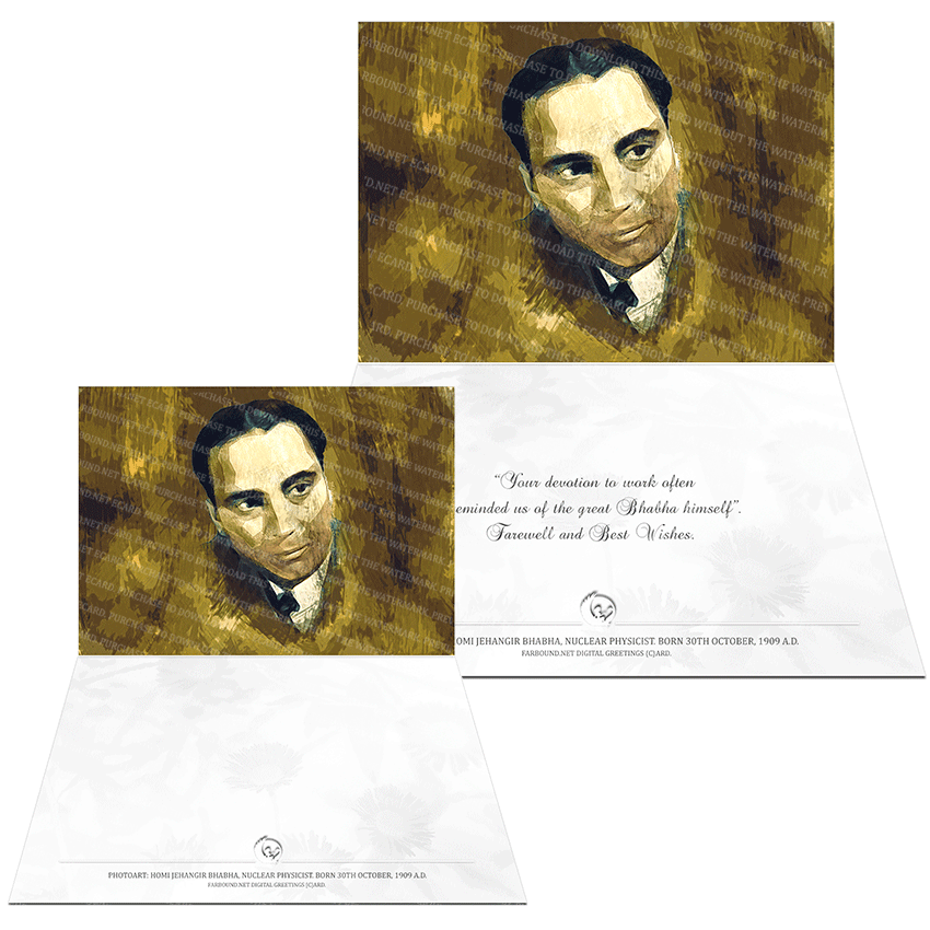 History: This Greetings Card/Farewell Card/Goodbye Card/Going-Away Card/Leaving Card for commemorating historical people and bidding farewell and luck to friends, family and colleagues, features a photoart presentation of Homi Jehangir Bhabha. Born on the 30th of October in 1909 Ce, Homi Bhabha was a nuclear physicist, a humanitarian and a friend of the environment. Homi Bhabha was also a fellow of the Royal Society and an awardee of the prestigious Padma Bhusan. Homi Bhabha is remembered as the father of India's nuclear Age.