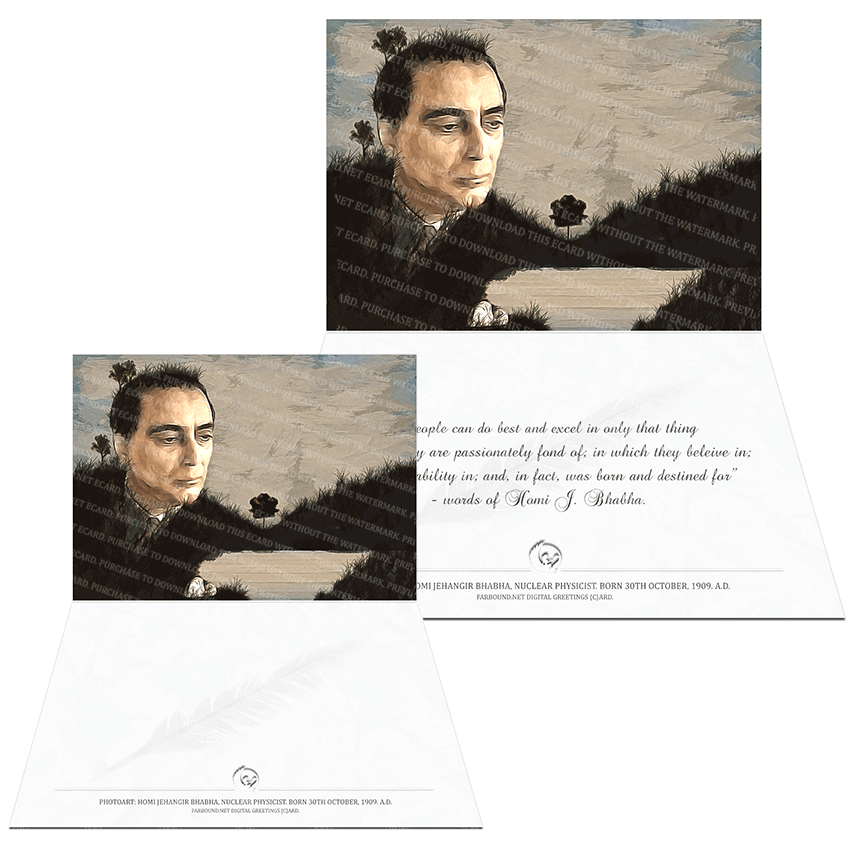 History: This Greeting Card with a Genuine Quotation features a photoart presentation of Homi Jehangir Bhabha. Born on the 30th of October in 1909 Ce., Bhabha was a Nuclear Physicist, a humanitarian and a friend of the environment. He was a fellow of the Royal Society and an awardee of the prestigious Padma Bhusan title of merit. Bhabha is remembered as the father of India's Nuclear Age.