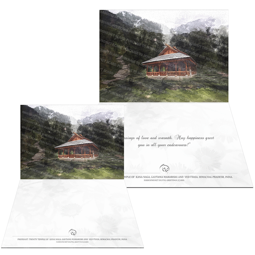 History/Mythology: This Greetings Card/Good Wishes Card/Festive Card for sending good wishes to friends and family on the festive occasion of Dussehra, features a photoart presentation of the Trinity temple of Goshal - a temple dedicated to Gautama Maharishi, Ved Vyasa, and the Himalayan Deity, Kana Naga. A Serpent Deity, Kana Naga is represented with the iconography of a hooded Cobra, and is a part of Himalayan folklore and Himalayan mythology with his own unique identity and legends. Serpent worship in the present-day country of India is speculated to have predated the slow migration of the nomadic Vedic tribes who later flooded the region with their religion of Hinduism. Some historians and scholars believe such tribes inhabited the Northern State of Himachal in India and worshiped the serpent. In local folklore, one finds the mention of 18 serpent deities, of which Kana Naga is a one-eyed-blind serpent deity. To know more, see the Farbound.Net story: Trinity Temple of Goshal. The card is also meant for local festivals, casual or other special occasions.