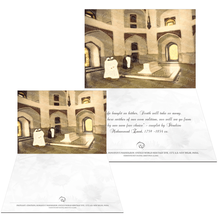 History: This Greetings Card with a couplet on life and death by the poet Ibrahim Mohammad Zaud (17 -18 Ce), features a photoart presentation of Humayun's white marble cenotaph at Humayun's Mausoleum in New Delhi, India. The mausoleum is a UNESCO World Heritage site and was one of the first architectural marvels to be built by the Gurkani. The mammoth structure was sponsored by Bega Begum, queen and chief consort of the second Gurkani (Mughal) emperor, Nasir-ud-din-Muhammad Humayun.