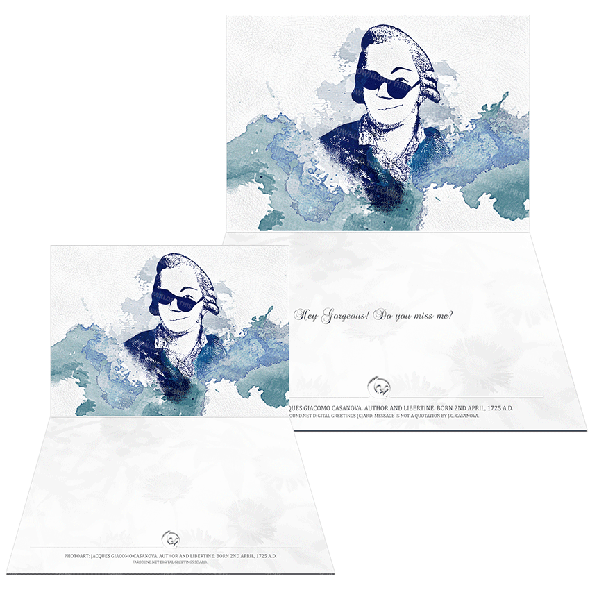 History: This Greetings Card/Sentimental Card/Flirty Romantic/Miss me Card features, a photoart representation of Jacques Giacomo Casanova. Born on the 2nd of April in 1725 Ad., Giacomo Casanova was a Venetian libertine, playboy and author. He was notorious for his many affairs, especially with married women.