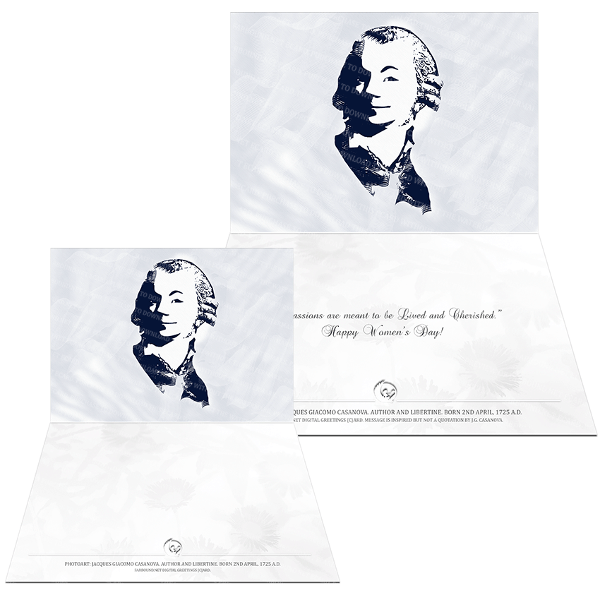 History: This Greetings Card for Women's Day features a photoart representation of Jacques Giacomo Casanova. Born on the 2nd of April in 1725 Ad, Jacques Giacomo Casanova was a Venetian libertine, playboy and author. He was notorious for his many affairs, especially with married women.