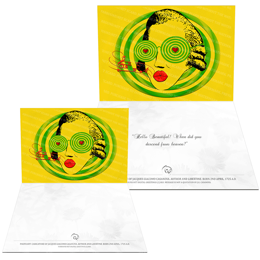History: This Greetings Card/Sentimental Card/Romantic Card/Flirty Card for expressing heartfelt sentiments, features a photoart representation of Jacques Giacomo Casanova. Born on the 2nd of April in 1725 Ad., Giacomo Casanova was a Venetian libertine, playboy and author. He was notorious for his many affairs, especially with married women.