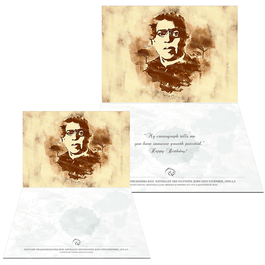 History: This Greetings Card for Birthdays features a photoart presentation of naturalist and polymath Sir Jagdish Chandra Bose. Born on the 30th of November in 1858 Ce., in British India, Jagdish Bose was a botanist, a physicist, and a science fiction writer. He is known worldwide for his contributions in the field of Radio Science and Plant Psychology. He was honoured with the Order of the Star of India and the Order of the Indian Empire (titles of recognition). Jagdish Bose was also the founder of the Bose Institute in Calcutta, the first of its kind, established to foster and promote scientific research among indigenous people.