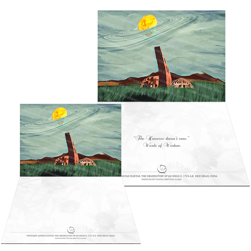History: This Greetings Card/Meaningful Card with words of wisdom on the uncaring nature of the universe, features a photoart presentation of the Ram Yantra, the Samrat Yantra and the Misra Yantra inside the Jantar Mantar observatory in New Delhi. The observatory was commissioned by Jai Sign II in 1723-24 Ce. All three structures are instruments for observation. The Ram Yantra was used to measure the altitude and azimuth of celestial objects. The Misra Yantra was used to determine the shortest and longest days of the year. While the Samrat Yantra was an equal hour sundial used to measure declination and coordinates of celestial objects.