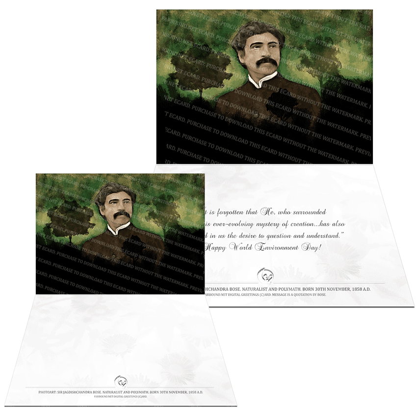 History: This Greetings Card/Environment Day Card for commemorating historical people and wishing friends, colleagues and family members on Environment Day, features a photoart presentation of naturalist and polymath Sir Jagdish Chandra Bose. Born on the 30th of November in 1858 Ce, in British India, Jagdish Bose was a botanist, a physicist, and a science Fiction writer. Jagdish Bose is known worldwide for his contributions in the field of Radio Science and Plant Psychology. Jagdish Bose was honoured with the Order of the Star of India and the Order of the Indian Empire. He was also the founder of the Bose Institute in Calcutta, the first of its kind, established to foster and promote scientific research among indigenous people.