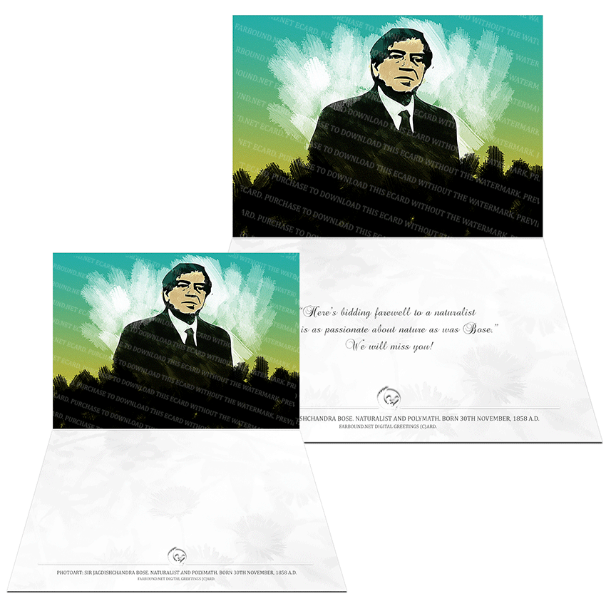 History: This Greetings Card/Farewell Card/Goodbye Card/Going-Away Card/Leaving Card for commemorating historical people and bidding farewell and luck to friends, family and colleagues, features a photoart presentation of naturalist and polymath Sir Jagdish Chandra Bose. Born on the 30th of November in 1858 Ce in British India, Jagdish Bose was a botanist, a physicist, and a science Fiction writer. Jagdish Bose is known worldwide for his contributions in the field of Radio Science and Plant Psychology. He was honoured with the Order of the Star of India and the Order of the Indian Empire. Jagdish Bose was also the founder of the Bose Institute in Calcutta, the first of its kind, established to foster and promote scientific research among indigenous people.