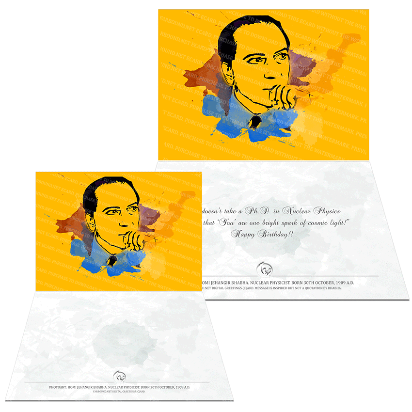 History: This Greeting Card for Birthdays features a photoart presentation of Homi Jehangir Bhabha. Born on the 30th of October in 1909 Ce., Homi Bhabha was a Nuclear Physicist, a humanitarian and a friend of the environment. He was a fellow of the Royal Society and an awardee of the prestigious Padma Bhusan title of merit. Homi Bhabha is remembered as the father of India's Nuclear Age.