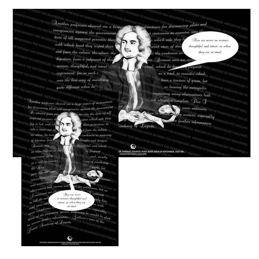 History: This Digital Wallpaper/Desktop Wallpaper/Desktop Background/Laptop Wallpaper/Mobile Phone Wallpaper/Black and White Wallpaper/Famous people Wallpaper for commemorating, honoring and remembering famous people, features a photoart presentation of Jonathan Swift. Born on the 30th of November in 1667 Ad, Jonathan Swift was an Anglo-Irish author, satirist, essayist and poet. His most widely known satirical masterpiece is Gulliver's Travels. This wallpaper also features an extract from the very same book. The extract comes from the third part of Gulliver's Travels titled, A Voyage to Laputa, Balnibarbi, Glubbdubdrib and Luggnagg. It is also featured as a Quote in the wallpaper.
