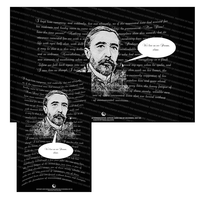 History: This Digital Wallpaper/Desktop Wallpaper/Desktop Background/Laptop Wallpaper/Mobile Phone Wallpaper/Black and White Wallpaper/Famous people Wallpaper for commemorating, honoring and remembering famous people, features a photoart presentation of Jozef Teodor Konrad Korzeniowski, more popularly known as Joseph Conrad. Born on the 3rd of December in 1857 Ad, Joseph Conrad is regarded as one of the greatest story tellers in the English language, even though English was not his mother tongue. Joseph Conrad's most memorable novels include Lord Jim and the Heart of Darkness. The Wallpaper also features an extract from one of his literary works and one of his quotes.