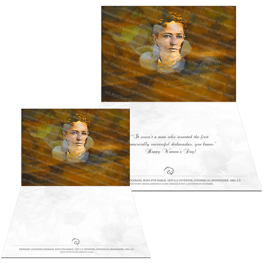 History: This Greetings Card for Women's Day features a photoart representation of a black and white portrait of Josephine Garis Cochrane. Born on the 8th of March in 1839 A.D., Josephine invented the first commercially successful dishwasher, patented in 1886 A.D.
