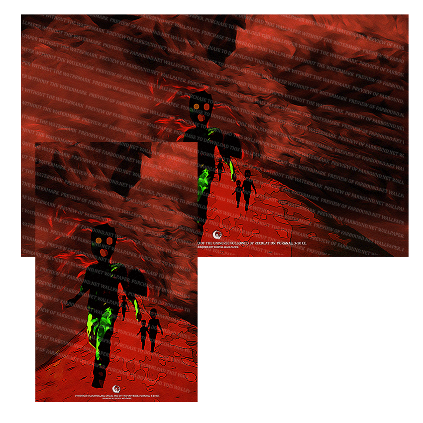 History: This Digital Wallpaper/Desktop Wallpaper/Desktop Background/Laptop Wallpaper/Mobile Phone Wallpaper/Vedic Wallpaper features a photoart presentation of the Mahapralaya, the end of the Universe. According to the Vedic system of belief, the Mahapralaya is the cyclic end of the Universe and recreation. When the Mahapralaya occurs all living beings, gods and everything else in the universe is incinerated/dissolved only to be recreated again. This cyclic event, especially the belief the world will be eventually dissolved, is to be found not just in the Vedic religion but several other religions and in cultures that sprouted, disappeared or endured throughout history.