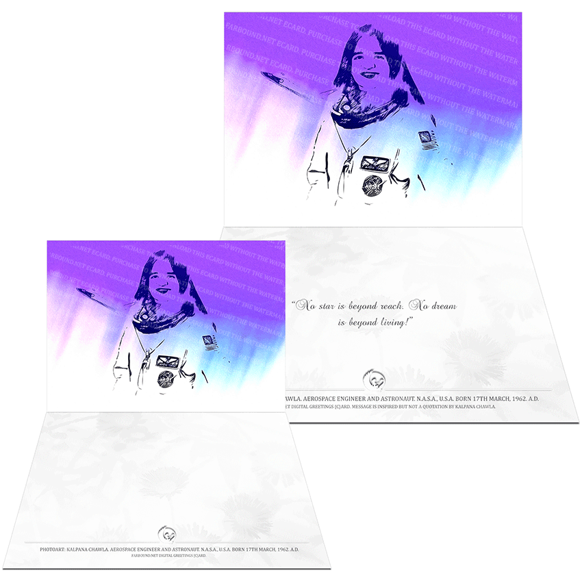 History: This Greetings Card/Motivational Card/Encouragement Card/Inspirational Card for commemorating historical people and inspiring friends and loved ones to achieve their dreams, features a photoart presentation of Kalpana Chawla. Born on the 17th of March in 1962 Ce, Kalpana Chawla was an aerospace engineer and astronaut. She was also the first woman of Indian origin to reach outer space.
