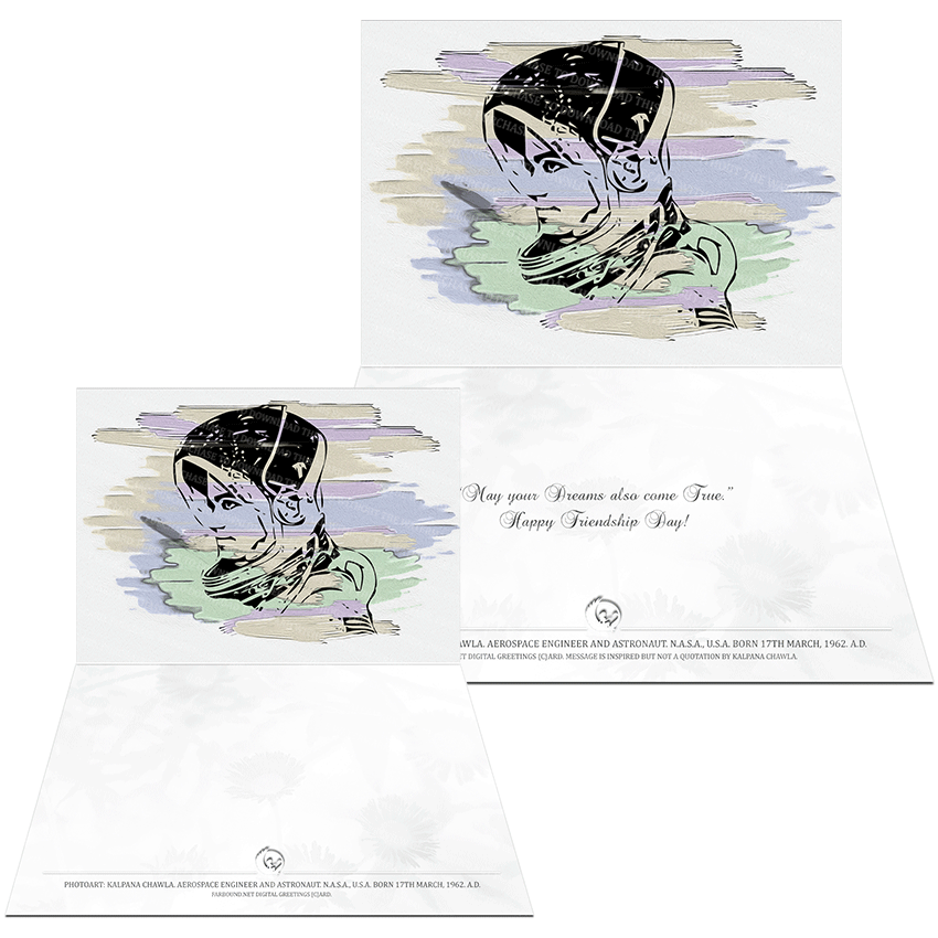 History: This Greetings Card/Sentimental Card/Friendship Day Card for commemorating historical people and expressing heartfelt sentiments to a friend, features a photoart presentation of Kalpana Chawla. Born on the 17th of March in 1962 Ce., Kalpana Chawla was an aerospace engineer and astronaut. She was also the first woman of Indian origin to reach outer space.