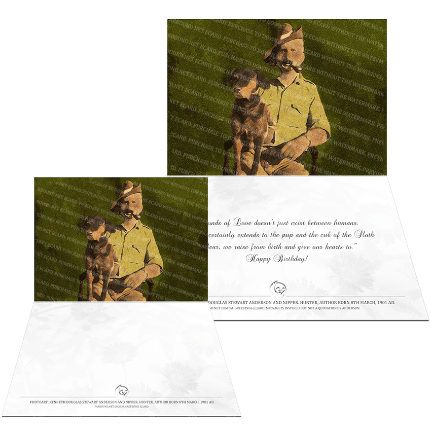 History: This Farbound.Net Digital Greetings Card for Birthdays features a photoart presentation of Kenneth Anderson and his dog Nipper. Born on the 8th of March in 1901 Ad, Kenneth Anderson was a hunter of man eating Bengal Tigers and Leopards, author and conservationist.