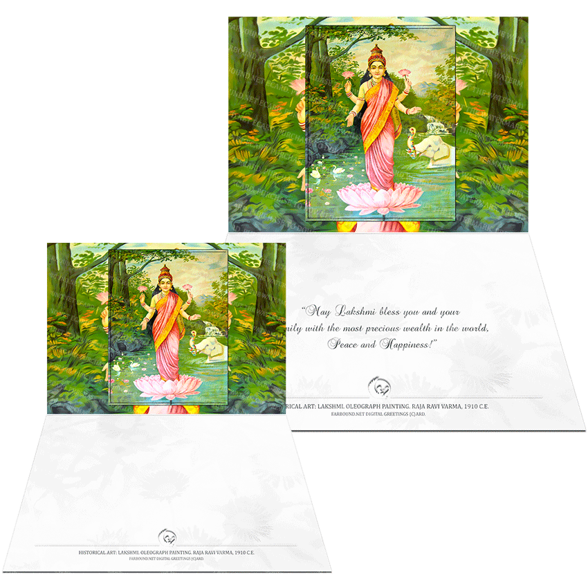 History: This Greetings Card/Good Wishes Card/Festive Card for sending good wishes to friends and family, features a historical painting titled, 'Lakshmi'. The painting is an oleograph painting and was created by artist Maha Raja Rajya Shri Ravi Varma, and published in 1910 Ce. The card is meant for the festivals of Diwali, Dhanteras, Lakshmi Puja, Sharad Purnima or any other special occasion