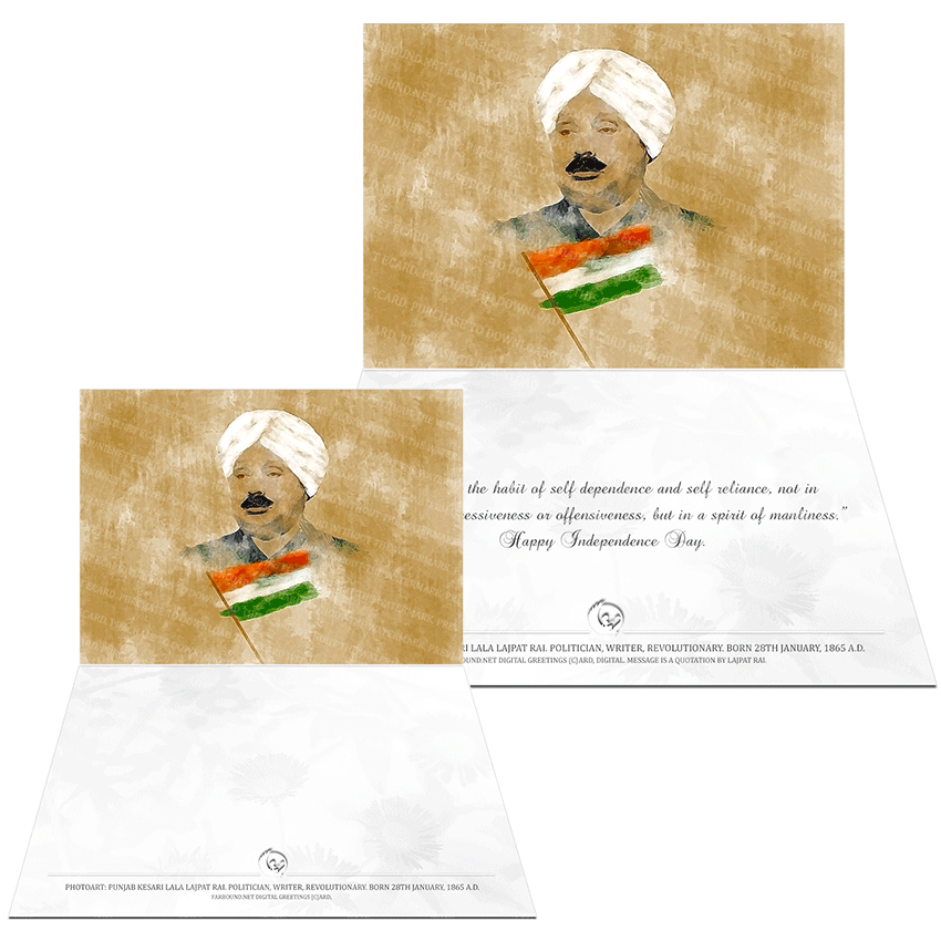 History: This Greetings Card/Independence Day Card/Celebratory Card for commemorating historical people and the Indian Independence Movement, features a photoart presentation of Lala Lajpat Rai. Born on the 28th of January in 1865 Ce, Lala Lajpat Rai was an Indian revolutionary and an Indian political activist. He was also a prolific writer, orator, social reformer and a key figure in the Indian Freedom Movement. He was bestowed with the Honorific 'Punjab Kesrai', the Lion of Punjab.