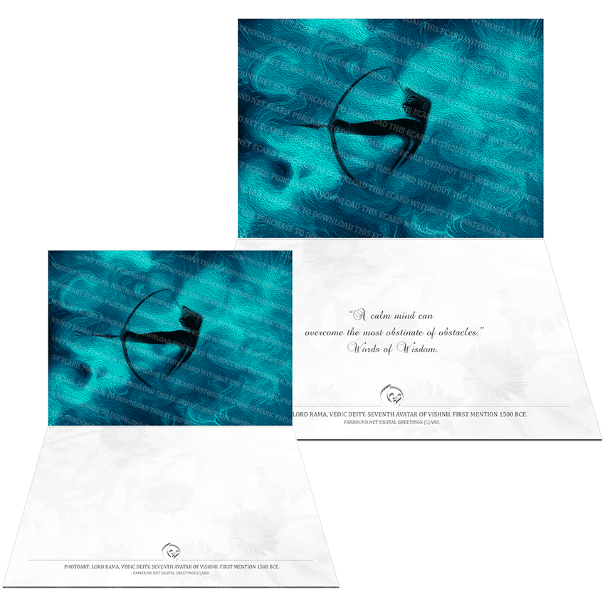 History/Mythology: This Greetings Card/Meaningful Card with words of wisdom on staying calm features a photoart presentation of Lord Rama, the hero of the epic Ramayana. In Hindu scriptures, Rama is stated to be the seventh reincarnation of Vishnu. In the epic, he is described as a cool and composed individual, and a kind-hearted deity. His symbol is the bow and arrow.