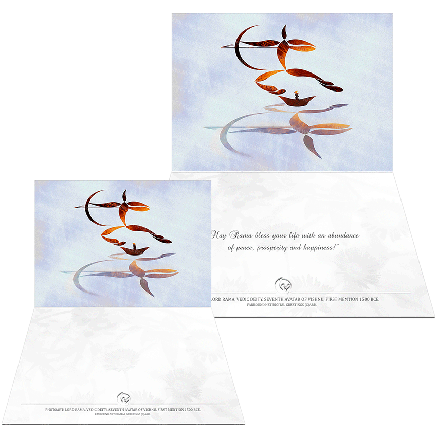 History/Mythology: This Greetings Card/Good Wishes Card/Festive Card for sending good wishes to friends and family, features a photoart presentation of Lord Rama, the hero of the epic Ramayana. In Hindu scriptures, Lord Rama is the seventh reincarnation of Vishnu. He is described as a cool and composed individual, and a kind-hearted deity. His symbol is the bow and arrow. The festival of Ram Navami celebrates the birth of Rama while the festival of Diwali, is said to have begun when Rama returned to Ayodhya after his 14 years of exile. The card is meant for the festivals of Diwali, Dussehra, Ram Navami or any other special occasion.